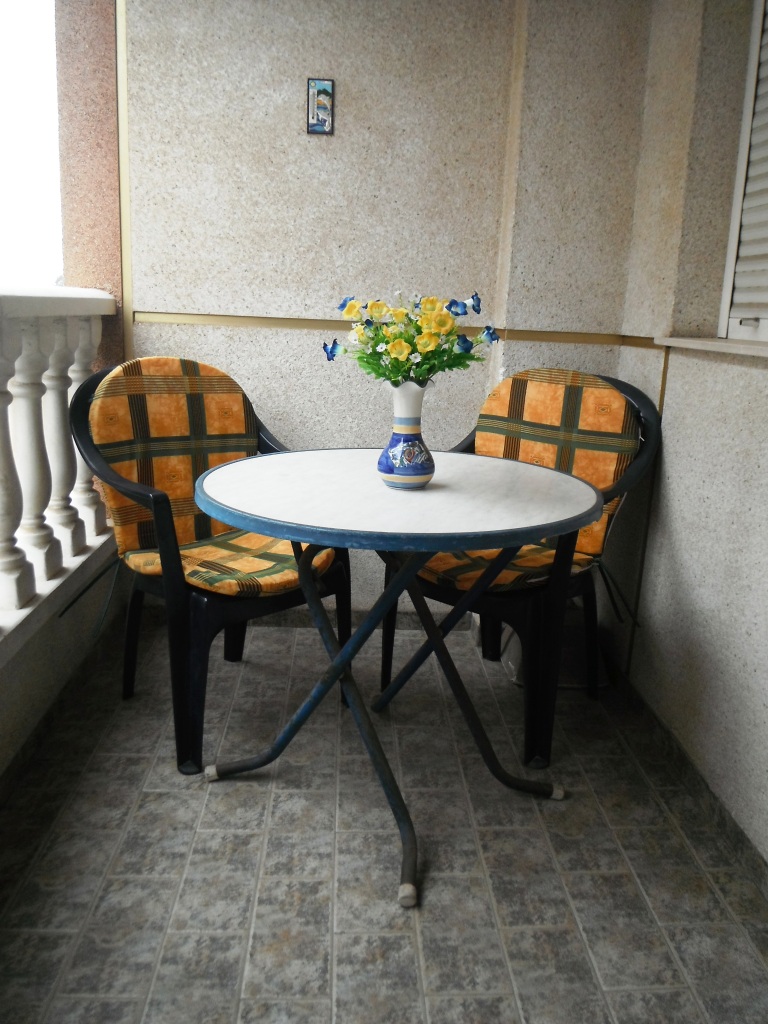 To the rear of the living room is a door leading to the balcony and a table and chairs are provided for outside dining.